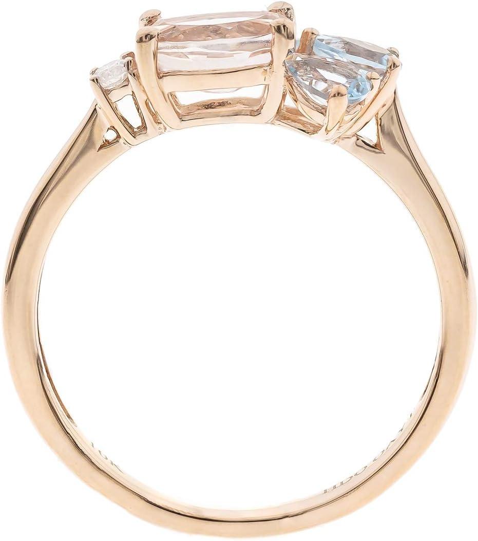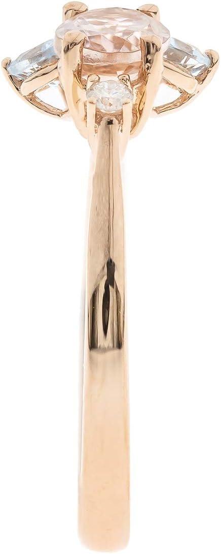 A large oval-cut Genuine Morganite gemstone is set at the center and 3 Genuine Aquamarine Gemstone of this lovely Gin & Grace ring, accentuated by one glittering diamond accents. This jewelry is crafted of 10-karat Rose gold with a sleek polish. Gemstone colors: Pink & Blue Gemstone shapes: Oval & Pear One prong-set oval-cut Morganite measure 5 mm wide x 7 mm long and Three Prong-set Pear-cut Aquamarine measure 3 mm wide x 4 mm long Total gemstone weight: 1.02 carats Diamonds: One Diamond cut: Round Diamond measurements: 1 mm Diamond weight: 0.04 carat Color: G-H Clarity: I1-I2 Setting: Prong Metal: 10k Rose gold Finish: High polish Metal weight: 1.80 grams Ring setting dimensions: 11 mm wide x 10 mm long Band dimensions: 2 mm wide