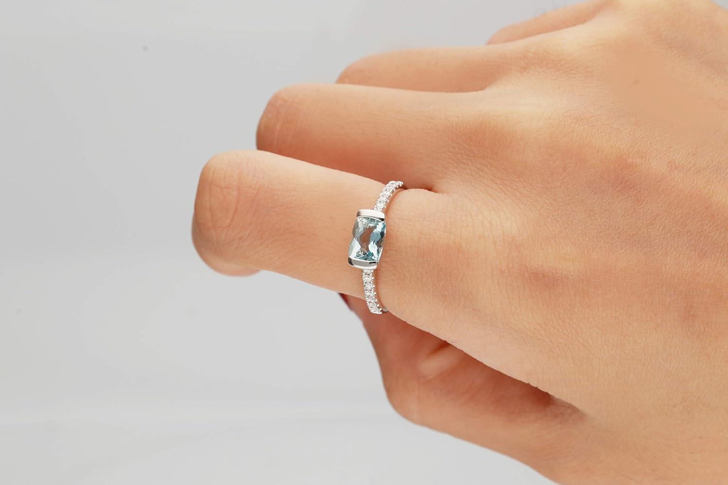 Stunning, timeless and classy eternity Unique ring. Decorate yourself in luxury with this Gin & Grace ring. The 10k White Gold jewelry boasts Cushion-Cut Channel Setting Genuine Aquamarine (1 pcs) 0.82 Carat and Round-Cut Prong Setting Natural Diamond (14pcs) 0.19 Carat accent stones for a lovely design. This ring is weight 1.83 grams. Crafted with 10k White Gold, this delicate Ring is polished to a high finish shine.