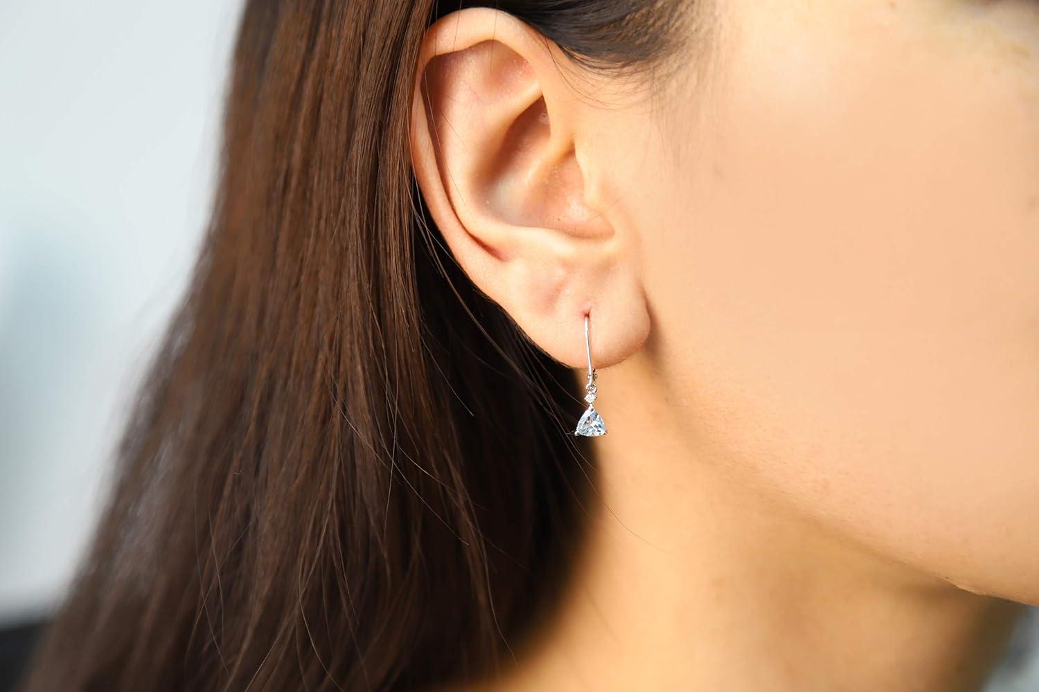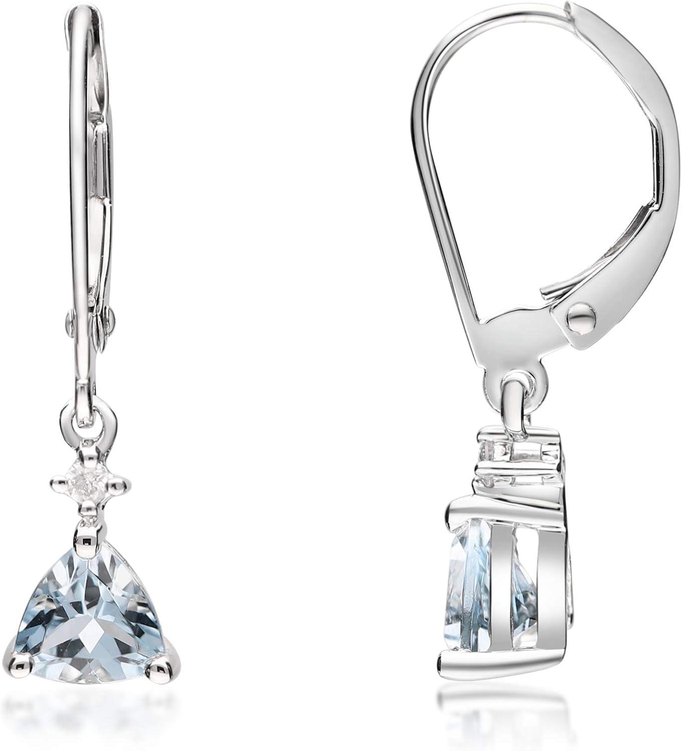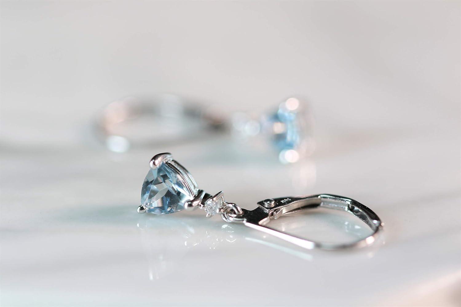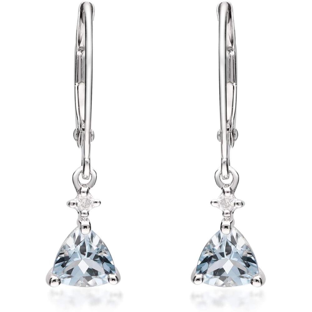 Decorate yourself in elegance with this Gin & Grace pair of earrings. The jewelry boasts trillion-cut aquamarine and diamond accent stones for a glistening design. Style: Dangle Gemstone colors: Blue Gemstone shapes: Trillion Two prong-set trillion-cut aquamarine each measure 5 mm Gemstone weight: 0.81 Carats Total gemstone weight: 0.81 Carats Diamonds: 2 Diamond cut: Round-cut measure 1 mm Diamond weight: 0.03 Carats Color: G-H Clarity: I1-I2 Setting: Prong-set Metal: 14K white gold Finish: High polish Clasp: Lever back Metal weight: 1.07 Grams Earring dimensions: 6.4 Mm wide x 23 mm long